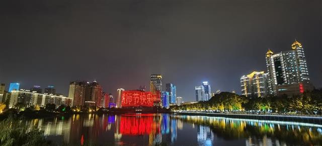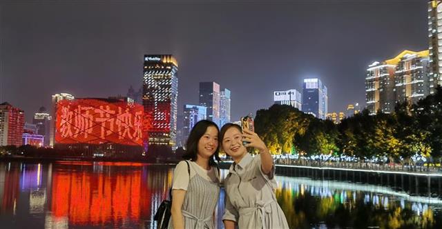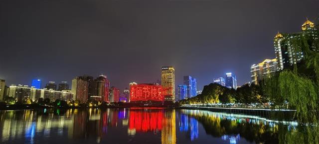 9月9日晚,市民在武汉双湖桥上与汉秀剧场打出的“教师节快乐”合影。当晚,武汉两江四岸建筑群、武汉长江二桥、龟山电视塔、汉秀剧场等地标性建筑以及出租车通过LED屏幕滚动方式为教师“亮灯”,滚动播放“教师节快乐!”“老师,您辛苦啦!”等话语,为全省广大教师和教育工作者送上节日问候。 (湖北日报全媒记者田悦 摄)