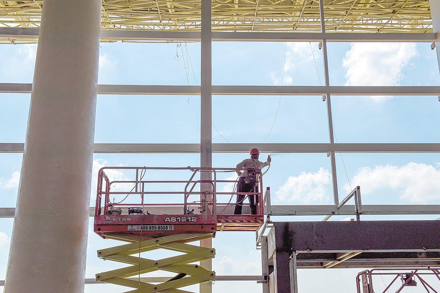 荆州机场建设工地,工人在机场航站楼作业。(视界网 黄志刚 摄)