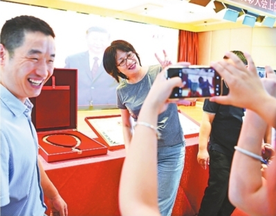 金银潭医院医务人员争相在“人民英雄”勋章前拍照留念。记者金振强 摄