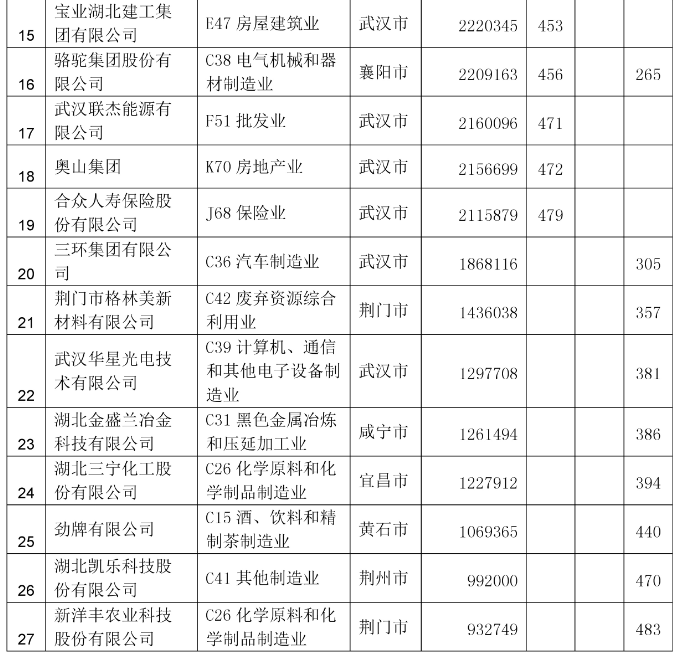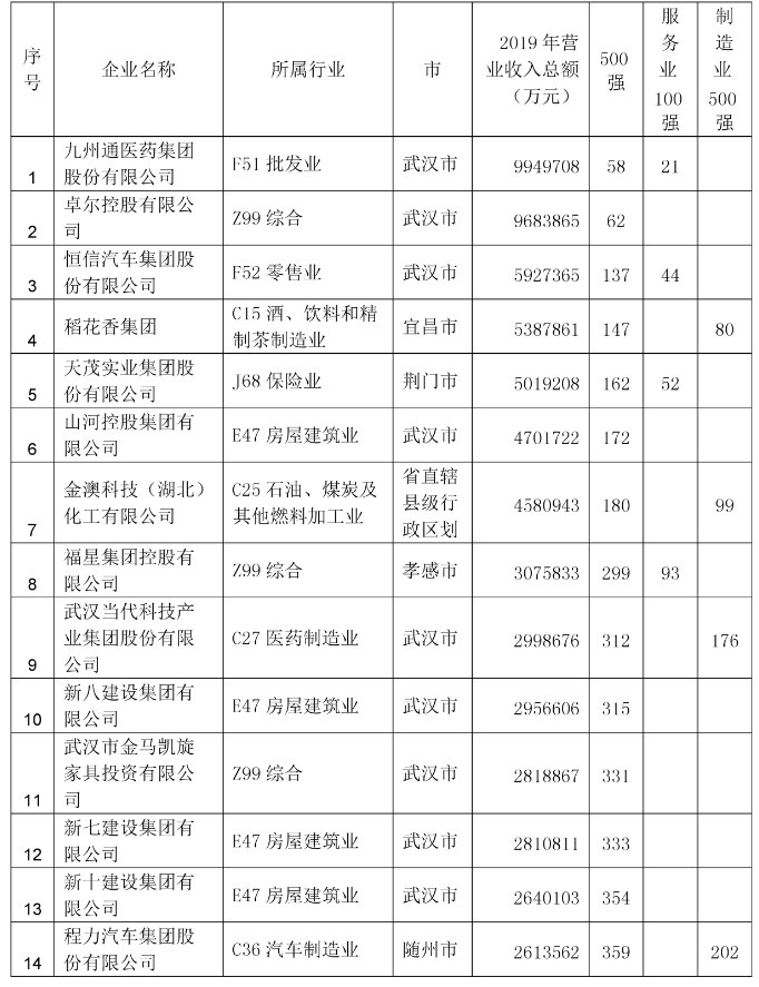 此外,湖北还有13家企业入选2020中国民营企业制造业500强,4家企业入选民企服务业100强。