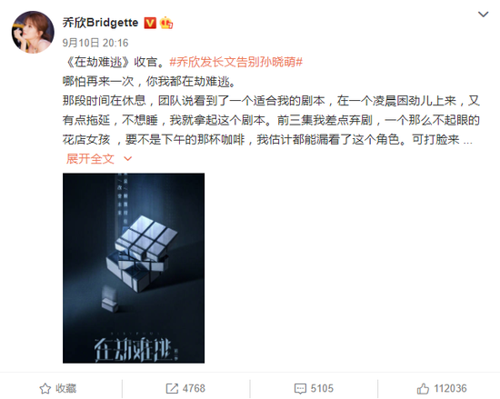 网易娱乐9月11日报道 9月10日,《在劫难逃》第一季收官,乔欣发长文告别自己饰演的角色孙晓萌。她直言“孙晓萌是我出道以来,看到过最心动的角色 ,没有之一。”并表示自己和同组演员学到了很多。文中她回忆了拍刘晓萌捅刘雨奇的戏份,感谢张皓然给自己的刺激,并称赞鹿晗的演技,“小鹿真的很棒,嘿嘿,你演得彬彬,让这场晓萌的角色动机一点都不难解。”正文最后乔欣也透露了《在劫难逃》第二季的拍摄计划。