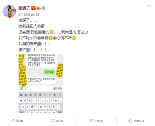 据悉,10日,阚清子被经纪人逼减肥和马思纯瘦了十斤纷纷登上热搜榜,引发了大家对女明星身材的讨论。而这次张馨予公开呼吁不要对女演员胖瘦太苛刻,不知众网友是否同意她的观点。