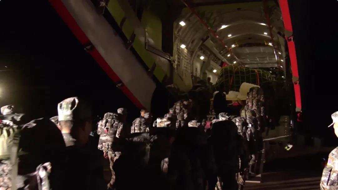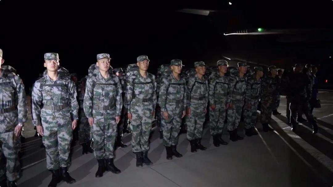 9月11日凌晨一点三十分,甘肃酒泉某军用机场,参演官兵整齐列队,指挥员组织部队有序进行人员、物资装载。