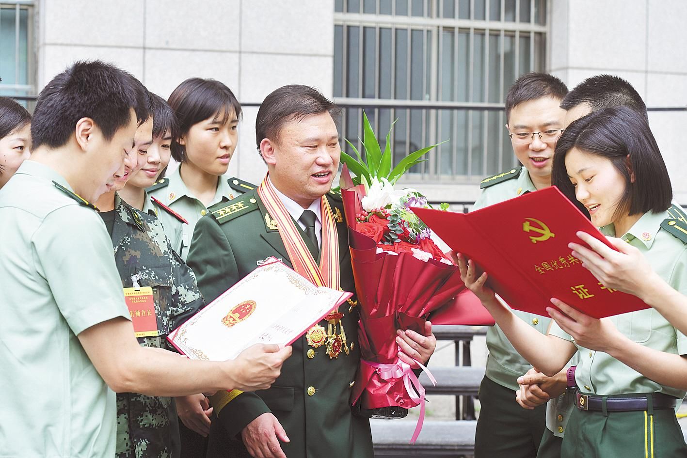 9月9日,武警湖北省总队举行欢迎仪式,迎接全国抗击新冠肺炎疫情先进个人和先进集体代表载誉归来。此次武警总队共有1个集体、2名个人受到表彰。图为荣获“全国抗击新冠肺炎疫情先进个人”“全国优秀共产党员”荣誉称号的总队医院门诊部副主任医师聂善化(中)与官兵热议伟大抗疫精神。