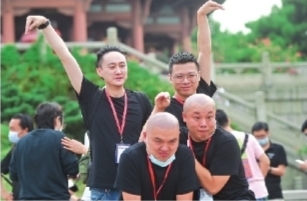 昆曲演员们在黄鹤楼前摆出造型留影。