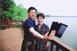 “梅花奖”获得者蒋建国、吴亚玲在东湖开心自拍。