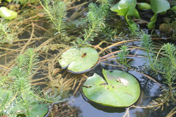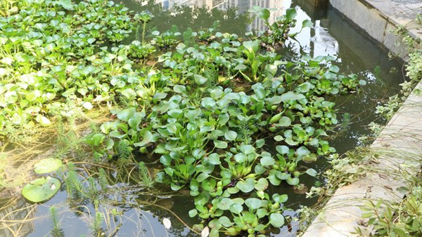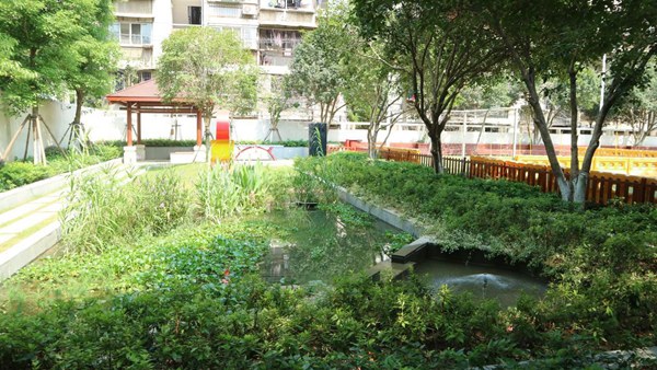 这处雨水花园“小微湿地”,种植了十余种水生植物及近水植物,并建有循环系统。以前学生下课都会操场或者教室走廊等处追逐嬉闹,课间活动行规习惯不是很好且存在一定安全风险。现在总是聚集在这片湿地前,仔细观察水生植物的生长细节,探究大自然奥妙之处。