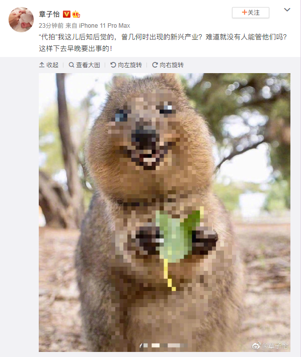 随后,章子怡发文怒斥代拍:“‘代拍’我这儿后知后觉的,曾几何时出现的新兴产业?难道就没有人能管他们吗?这样下去早晚要出事的!”