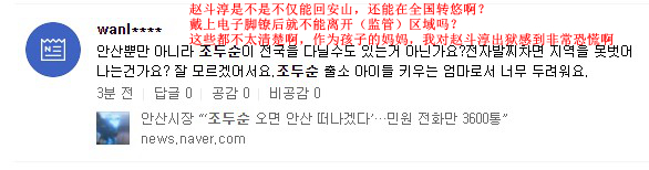 还有网友留言说,“赵斗淳是不是不仅能回安山,还能在全国转悠啊?戴上电子脚镣后就不能离开(监管)区域吗?这些都不太清楚啊,作为孩子的妈妈,我对赵斗淳出狱感到非常恐慌啊”。