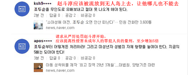关于赵斗淳出狱的消息也在网络上热议不断,韩国网友纷纷留言表达愤怒,“赵斗淳应该被流放到无人岛上去,让他哪儿也不能去”,“请求从严厉处罚赵斗淳开始,应该提高性侵害未成年人的罪犯人员的量刑,至少增加5倍”。