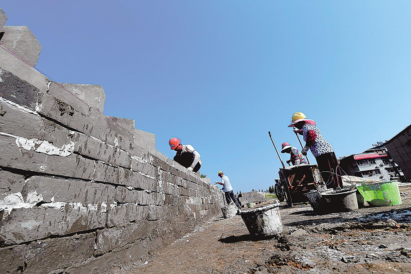 9月8日,施工人员在修缮襄阳古城墙。据襄阳市文物部门介绍,历史上襄阳城墙上有仲宣楼、魁星楼以及狮子楼,因为战乱先后被毁,此次国家文物局拨出专款对这段城墙进行大修,完工后,古城墙将恢复明清时期模样。(湖北日报全媒记者田悦 通讯员 谢勇 摄)