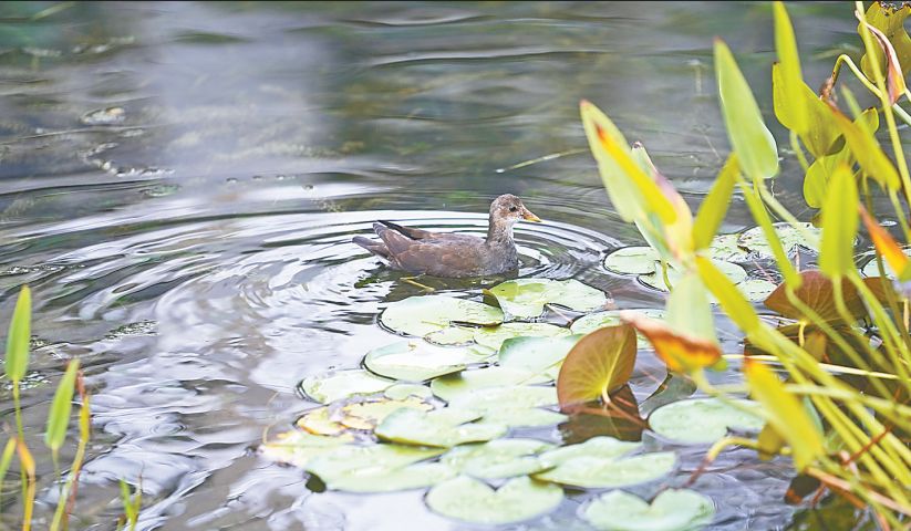 9月15日,记者路过西北湖看到,这里水道清澈。水下鱼儿穿梭自如,水上荷花点缀其间。野生黑水鸡幼崽在水面上游弋。
