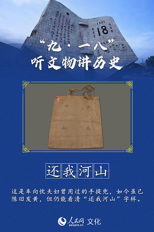 “还我河山”,车向忱夫妇用过的手提兜上,四个字依然清晰。“九·一八”事变后,东北沦陷,教育家车向忱多次往返关内外,积极组织抗日救亡运动,还创办了许多平民学校。这个手提兜原为白色,历经岁月和战火,现已陈旧发黄。布兜正面绣有黑色“收复东北失地,1938”字样,背面写有“还我河山”字样。