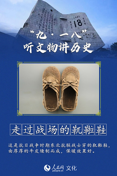 这是一双造型奇特的鞋:鞋面抽成一圈均匀的褶儿,褶儿后面是一个向上凸起的“舌头”,鞋口周边再窜上细细的牛皮带子。这种鞋被称作“靰鞡鞋”,是抗联战士们冬日作战的重要“装备”。靰鞡鞋用厚厚的牛皮缝制而成,既温暖又舒服。