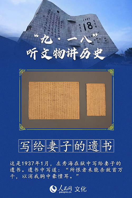 “所恨者未能杀敌首万千,以消我胸中豪愤耳。”“九·一八”事变后,积极组织领导凤城县抗日救国活动的左秀海不幸遭叛徒出卖被捕入狱。1937年1月,身在狱中的他用铅笔在黄色稻草纸上写下留给妻子的遗书,字字泣血。1937年农历正月二十二,左秀海被奉天日本陆军军事法庭以颠覆罪非法宣判死刑,英勇就义。