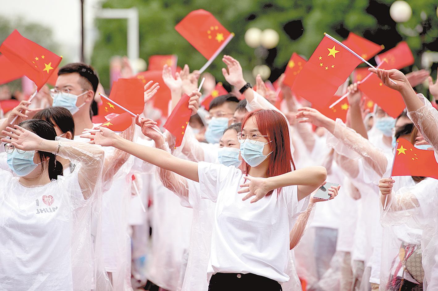 9月17日,江汉大学英才广场,新生参加开学典礼。当日,江汉大学举行2020级新生开学典礼,开学典礼以“相约江大 扬帆起航”为主题,并通过网络进行直播。据了解,江汉大学今年共招录4370名本科生、574名硕士研究生,其中4331名新生是“00后”,年龄最小的新生仅16周岁。 (湖北日报全媒记者 蔡俊 摄)