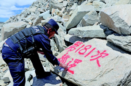 索朗达杰在岗布冰川巡逻时,在石块上标记巡逻次数。 本报记者刘小草摄
