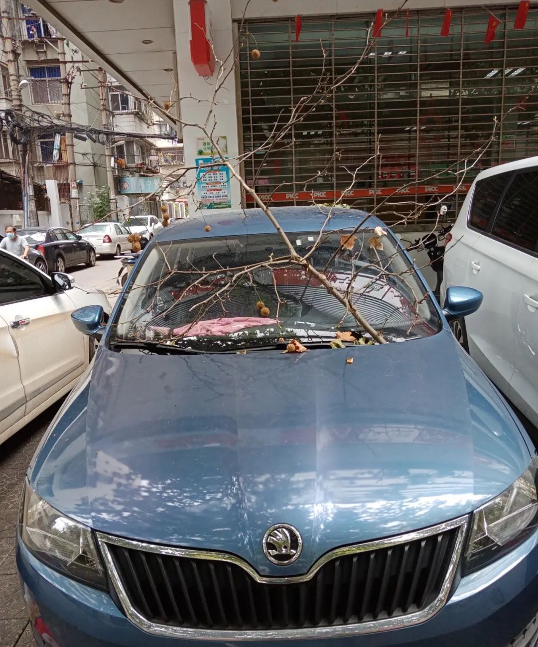 “简直是飞来横祸。”肖先生说,停车位附近有一棵行道树,是梧桐树,可能是刮风,枯枝被吹下。他仔细检查,爱车引擎盖、A柱、翼子板上有多处划痕。看到这一幕,他想到,几年前,一个街坊爱车停在路边,天窗被坠落的行道树枝砸坏,最后是园林部门用保险进行的赔偿。