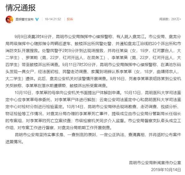 2019年10月14日,昆明警方通报:昆明市公安局综合现场勘查、走访调查、视频分析、物证检验等工作情况,对盘龙分局办理的李心草死亡事件提级成立由市公安局分管副局长任组长的专案组,对李心草死亡案立案侦查;市级检察机关同步介入监督。市公安局督察支队牵头成立工作组,对专案工作进行督察,对盘龙分局前期工作开展倒查。