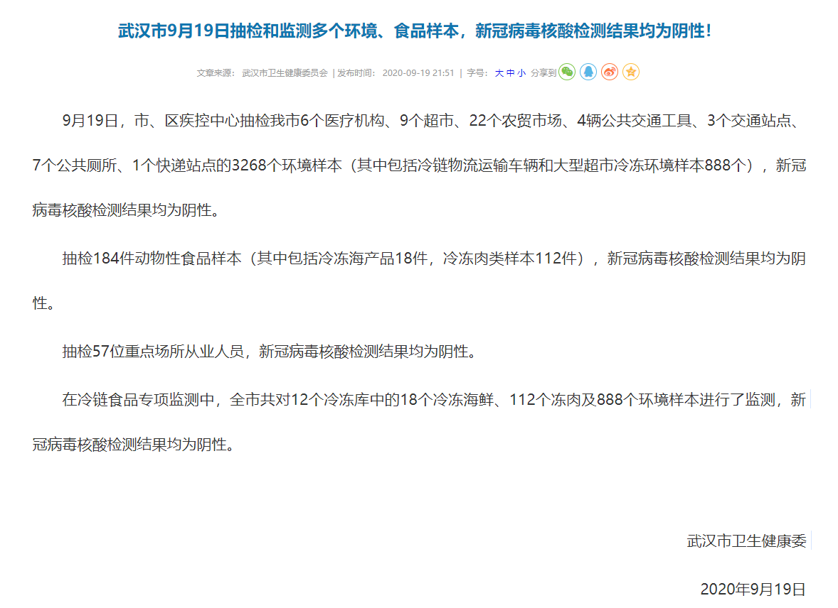 9月19日,市、区疾控中心抽检我市6个医疗机构、9个超市、22个农贸市场、4辆公共交通工具、3个交通站点、7个公共厕所、1个快递站点的3268个环境样本(其中包括冷链物流运输车辆和大型超市冷冻环境样本888个),新冠病毒核酸检测结果均为阴性。