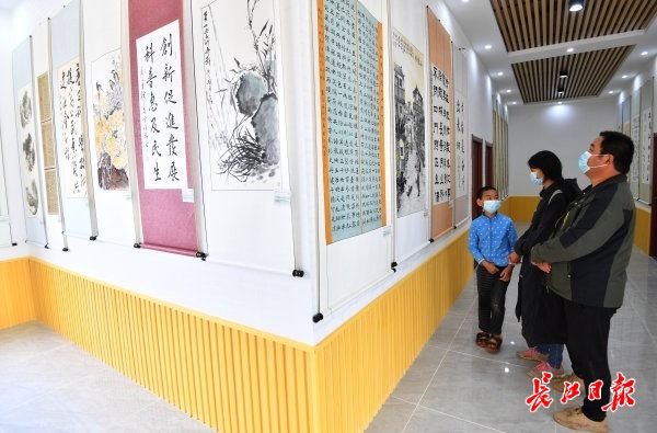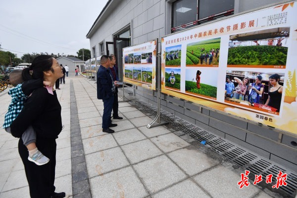 长江网9月20日讯9月20日,江夏区“庆丰收迎小康中国农民丰收节书画大赛作品展”和丰收节摄影展,在乌龙泉街茗泉谷举行。在场观展的当地群众,看着家乡一年年的新变化,倍感亲切和自豪。(记者喻志勇 摄影报道)