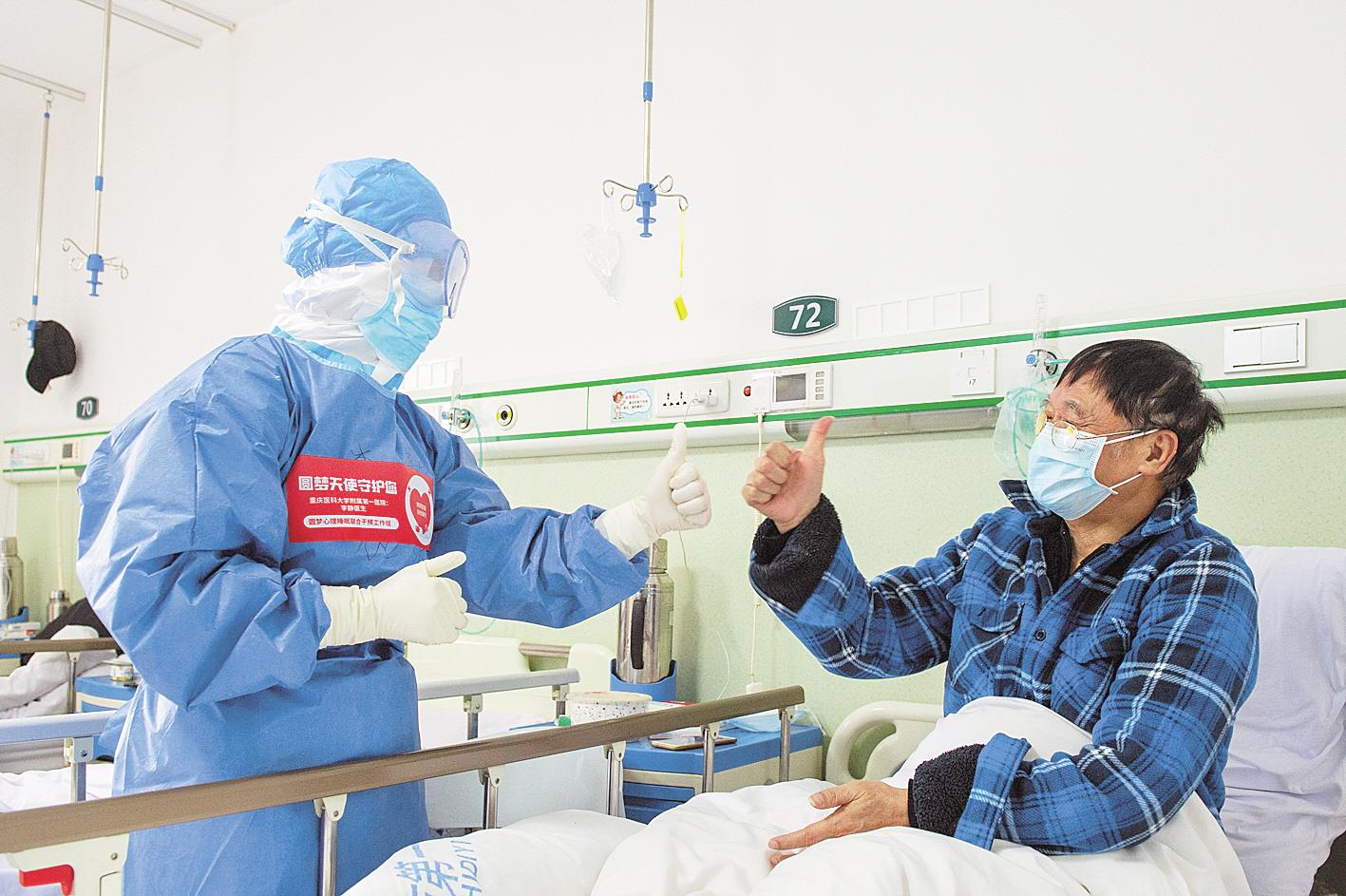 3月2日,武汉市第一医院感染科病区,重庆医科大学附属第一医院李静医生(左)为患者进行心理疏导,鼓励患者增强信心。 (湖北日报全媒记者 蔡俊 摄)
