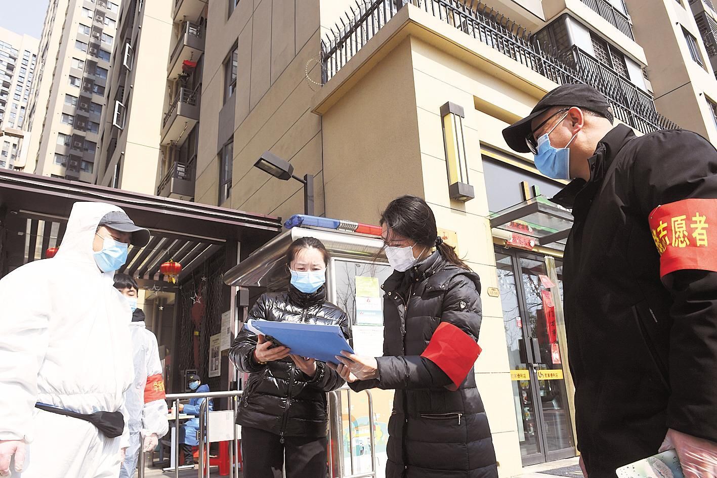 2月22日,武汉高科集团下沉党员(右二)在东湖高新区长山社区值勤,仔细核对出入人员名单。 (湖北日报全媒记者 田悦 摄)