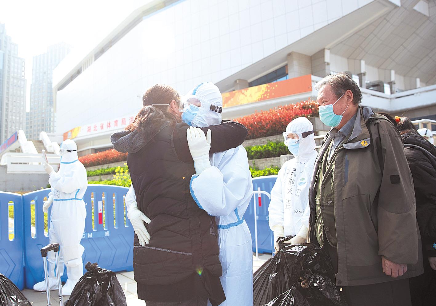 3月10日,武昌方舱医院,出舱的患者和湖南医疗队的护士拥抱告别。 (湖北日报全媒记者 柯皓 摄)