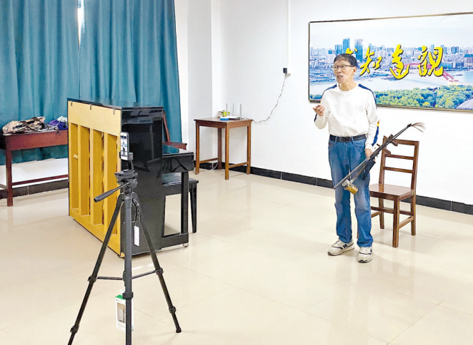 京韵京歌直播课,陈幼立老师对着镜头激情讲课。长江日报记者徐丹 摄