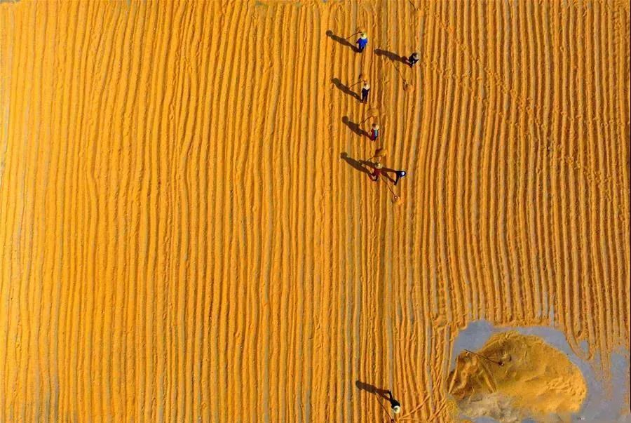 △ 山东省临沂市平邑县农民在晾晒收获的玉米