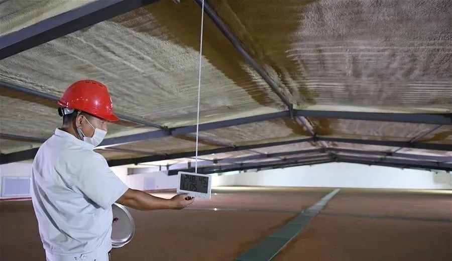 △ 7月15日,在中储粮新港直属库,工作人员在平房仓粮库中查看温湿度计