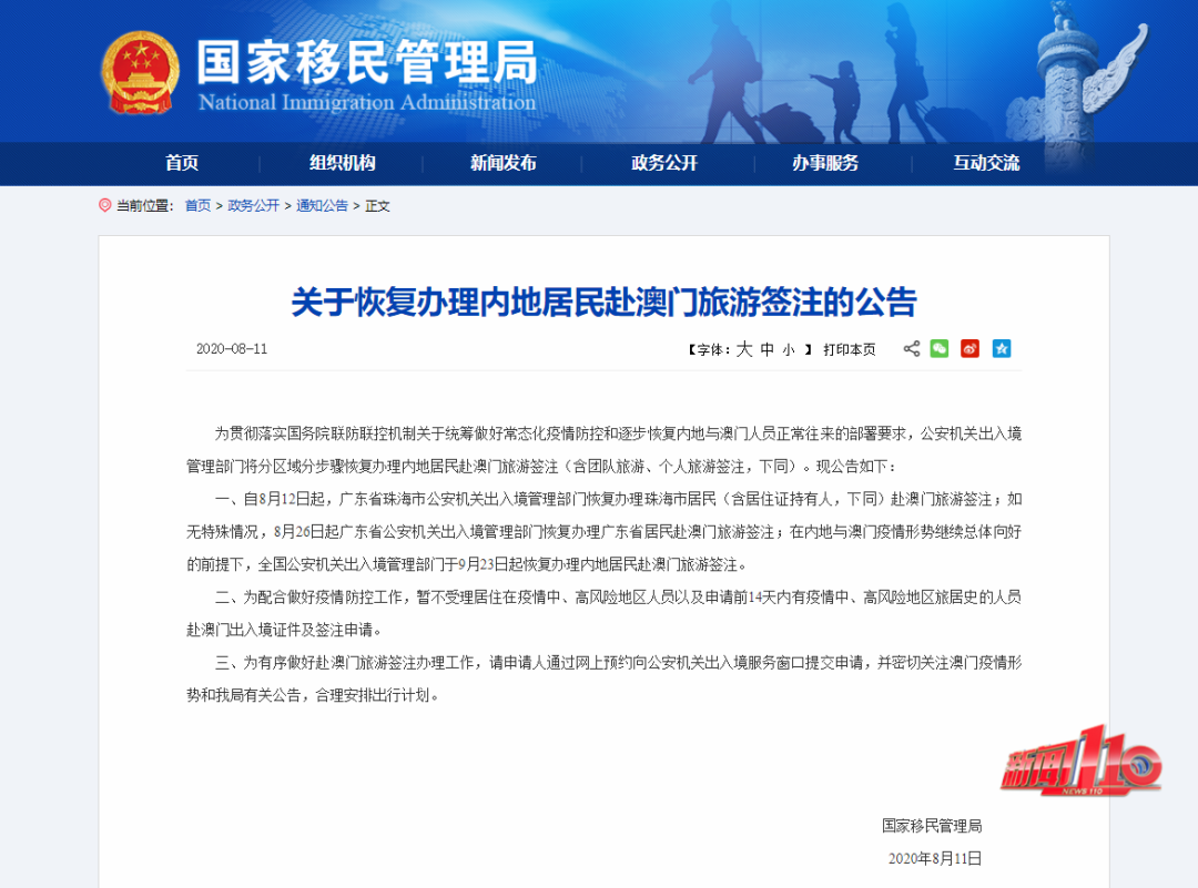 据@国家移民管理局消息:在内地与澳门疫情形势继续总体向好的前提下,全国公安机关出入境管理部门于9月23日起恢复办理内地居民赴澳门旅游签注,但暂不受理居住在疫情中、高风险地区人员以及申请前14天内有疫情中、高风险地区旅居史的人员赴澳门出入境证件及签注申请。
