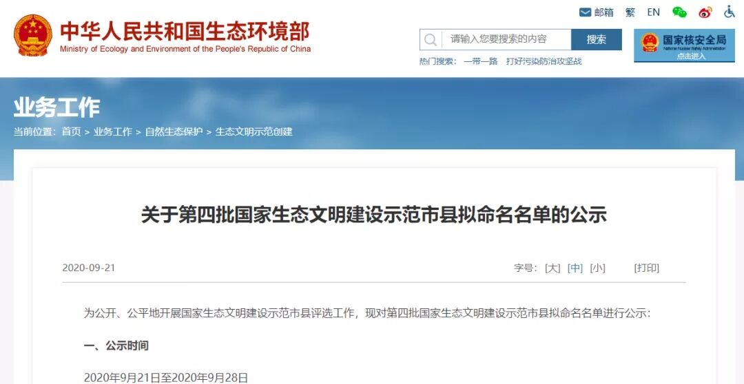 关于第四批国家生态文明建设示范市县拟命名名单的公示