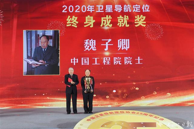 图为会上,中国工程院院士魏子卿获2020年卫星导航定位终身成就奖。