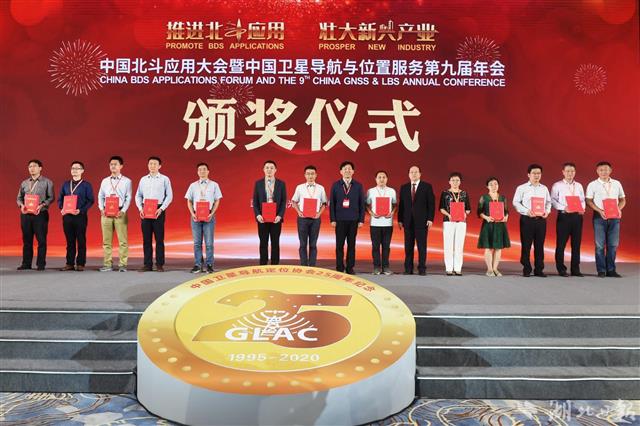 图为颁奖仪式上,表彰2020年度卫星导航定位科技进步奖、卫星导航定位创新应用奖获奖单位和个人。