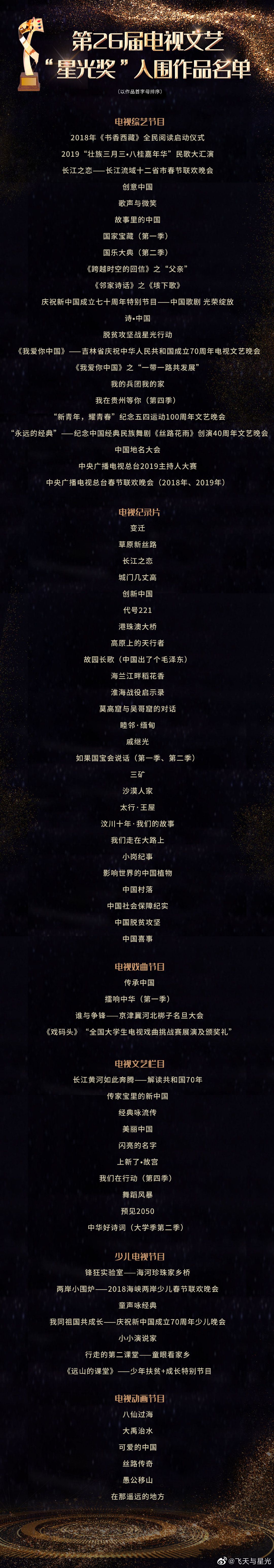 第26届电视文艺“星光奖”入围作品名单。“飞天奖”“星光奖”颁奖典礼活动新闻中心供图