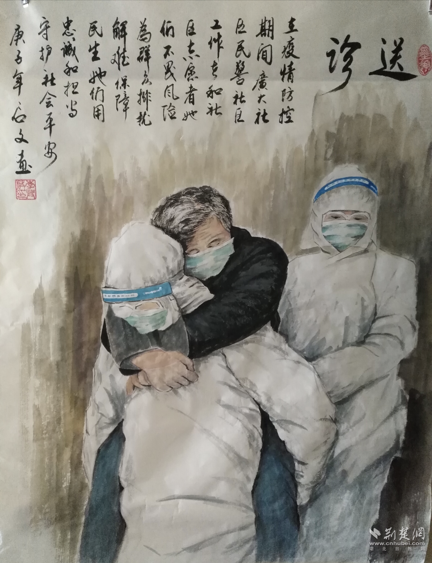 经过一番精心构思,李兴启开始动笔创作。经过半个多月的奋战,作品《送诊》完成。随后,李兴启又全身心地投入到第二幅、第三幅作品的创作之中。李兴启感叹道:“这场史无前例的‘群英战疫’值得我们每个人永远铭记,希望能通过画作表达对抗疫一线医护人员、社区工作者、志愿者的敬意和感恩之心,凝聚起中华民族抗击疫情的强大精神力量。”