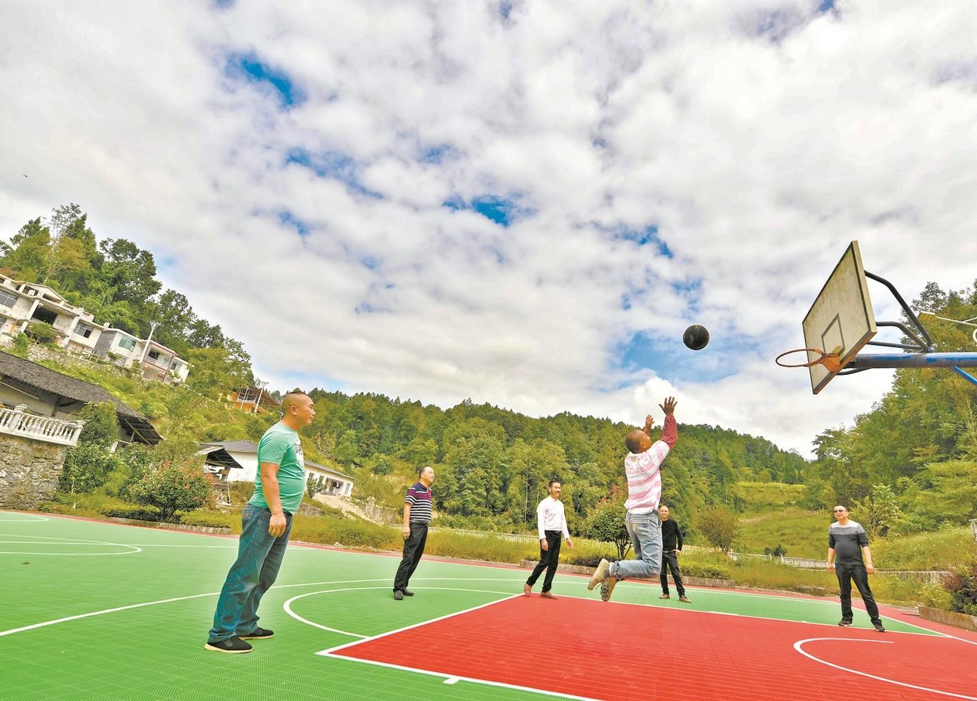 龙潭司村的标准化塑胶篮球场,居民劳作之余可以打篮球健身