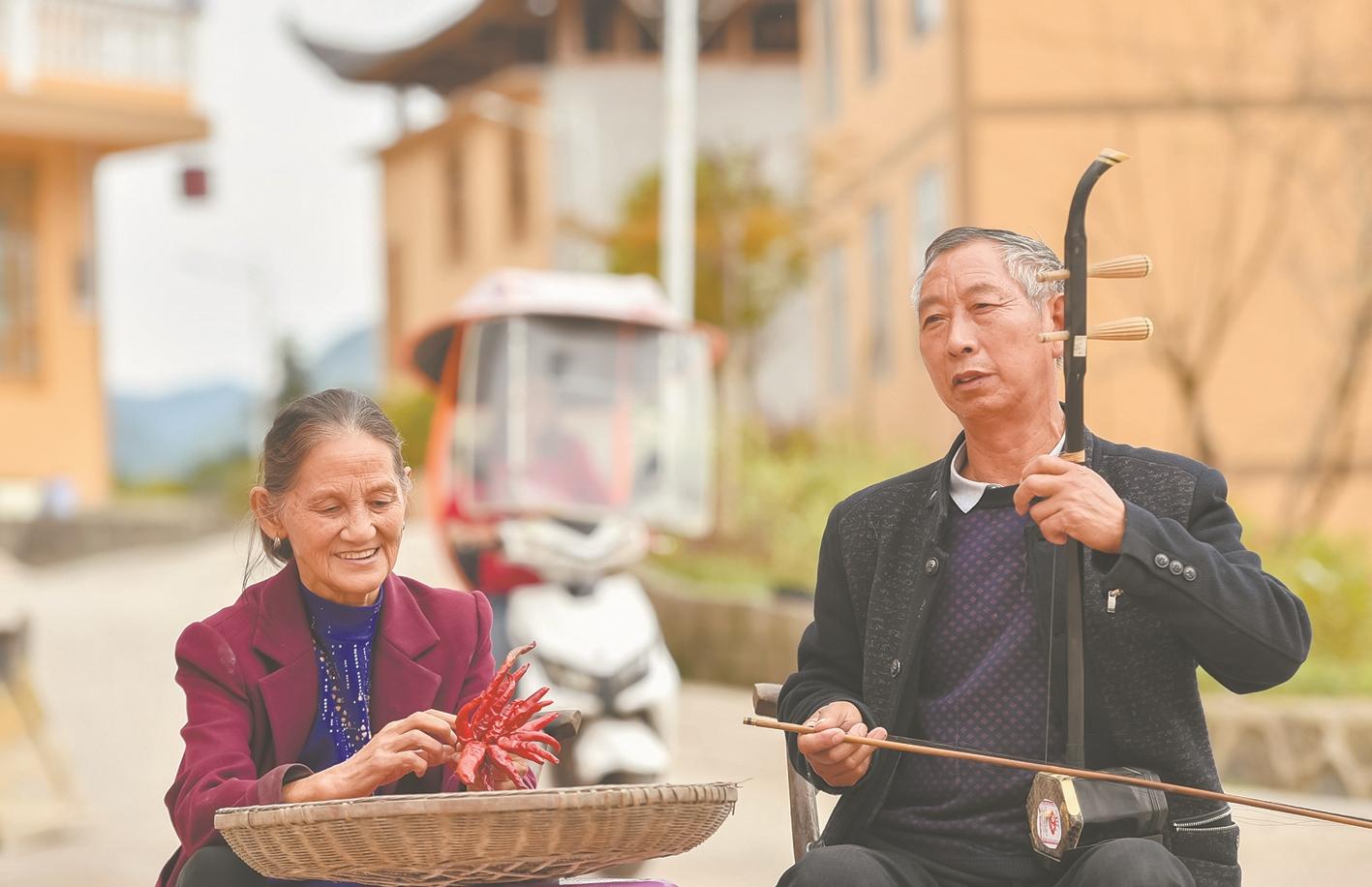 龙潭司村,村民周金章拉二胡,老伴在一旁捆辣椒,享受幸福生活