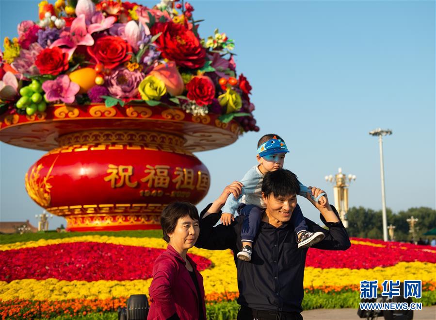 9月24日,游客们在天安门广场观赏“祝福祖国”大花篮。 当日,“祝福祖国”大花篮主体完工,亮相天安门广场。大花篮顶高18米,篮内摆放有全国各地代表性“花卉”及富有吉祥寓意的“果实”,花坛底部则是由鲜花构成的10颗红心图案。大花篮计划于25日正式完工。 新华社记者 陈钟昊 摄