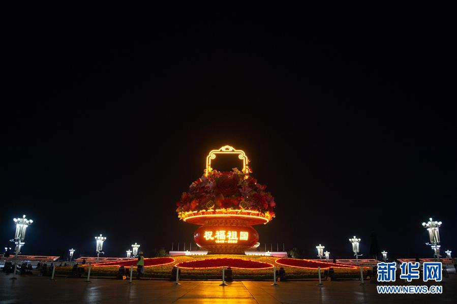 这是9月24日拍摄的在进行夜景灯光调试的“祝福祖国”大花篮。 当日,“祝福祖国”大花篮主体完工,亮相天安门广场。大花篮顶高18米,篮内摆放有全国各地代表性“花卉”及富有吉祥寓意的“果实”,花坛底部则是由鲜花构成的10颗红心图案。大花篮计划于25日正式完工。 新华社记者 陈钟昊 摄