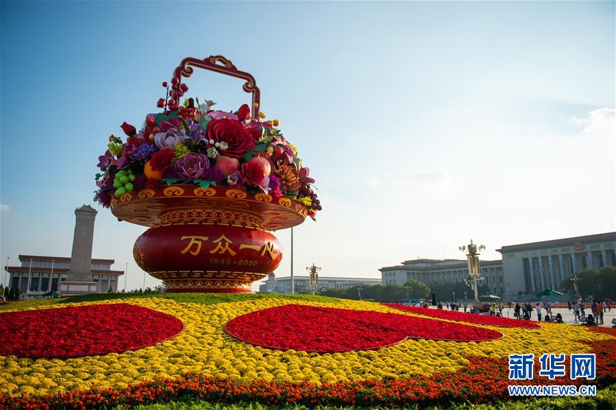 这是9月24日拍摄的“祝福祖国”大花篮。 当日,“祝福祖国”大花篮主体完工,亮相天安门广场。大花篮顶高18米,篮内摆放有全国各地代表性“花卉”及富有吉祥寓意的“果实”,花坛底部则是由鲜花构成的10颗红心图案。大花篮计划于25日正式完工。 新华社记者 陈钟昊 摄