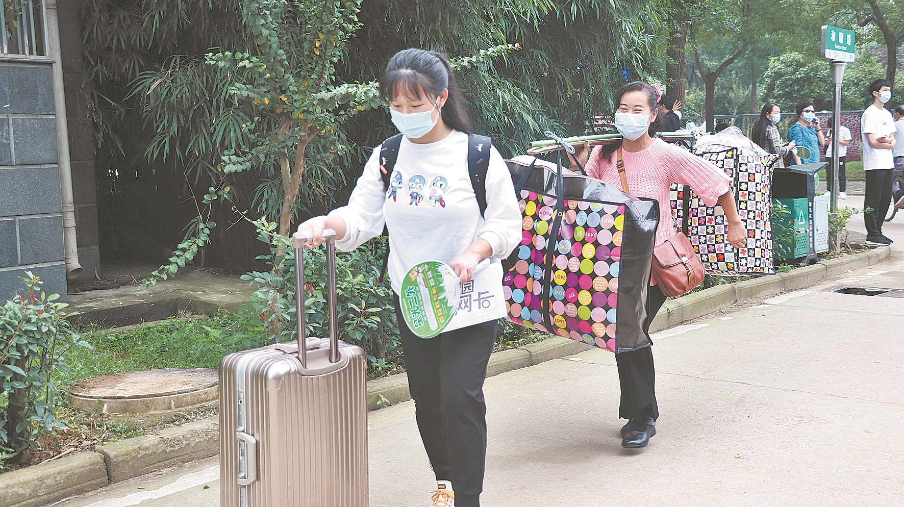 昨日一大早,兄妹俩和父母一起,从武汉市蔡甸区的家里出发。由于两个孩子的行李比较多,父母各自用扁担挑着进入校园。学校迎新志愿者要接过行李,但被双胞胎的父母婉拒。