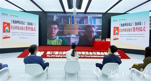 湖北日报讯(记者韩晓玲、通讯员张元元)9月26日,在第27届北京国际图书博览会湖北展区,湖北教育出版社与马来西亚科利提出版社“云签约”,输出《加油鸭抗疫记(漫画版)》英文、马来文和简体中文版权至马来西亚。可爱的“加油鸭”形象,将向当地孩子传递中国抗击疫情的成功经验。