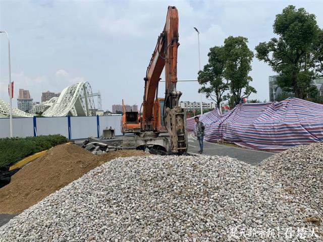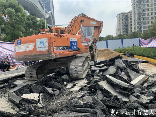 今天下午2时许,楚天都市报记者再次来到事发现场,在围挡内,一辆挖掘机正在轰隆作业,塌陷路面已被挖开,现场堆积了沙子和碎石块。湖北应急管理厅管理工作人员也赶到现场,了解情况,他们向现场负责人武汉地铁集团工作人员提出要求,在保证施工安全的情况下,尽快组织抢修,做好并完善施工和应急方案,最大限度的降低对国庆和中秋节的交通影响。