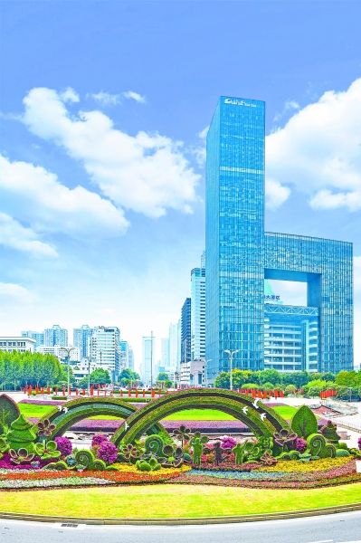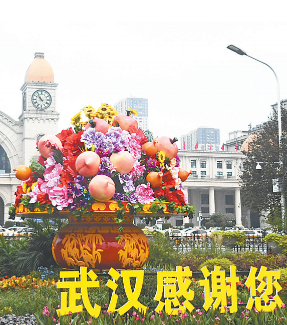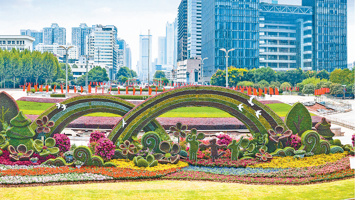 随着国庆节的临近,武汉三镇街头出现了多个立体花坛,造型各异的花坛扎景美化城市景观的同时,也营造了浓浓的节日氛围。图为位于洪山广场处的立体花坛。记者胡九思 通讯员杨升 摄