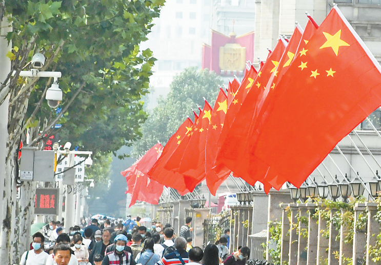一夜间满城尽带“中国红”4万面国旗挂上街头