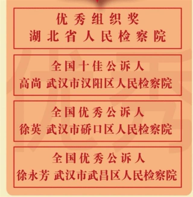 武汉市硚口区人民检察院一级检察官徐英、武汉市武昌区人民检察院三级检察官徐永芳荣获“全国优秀公诉人”称号。