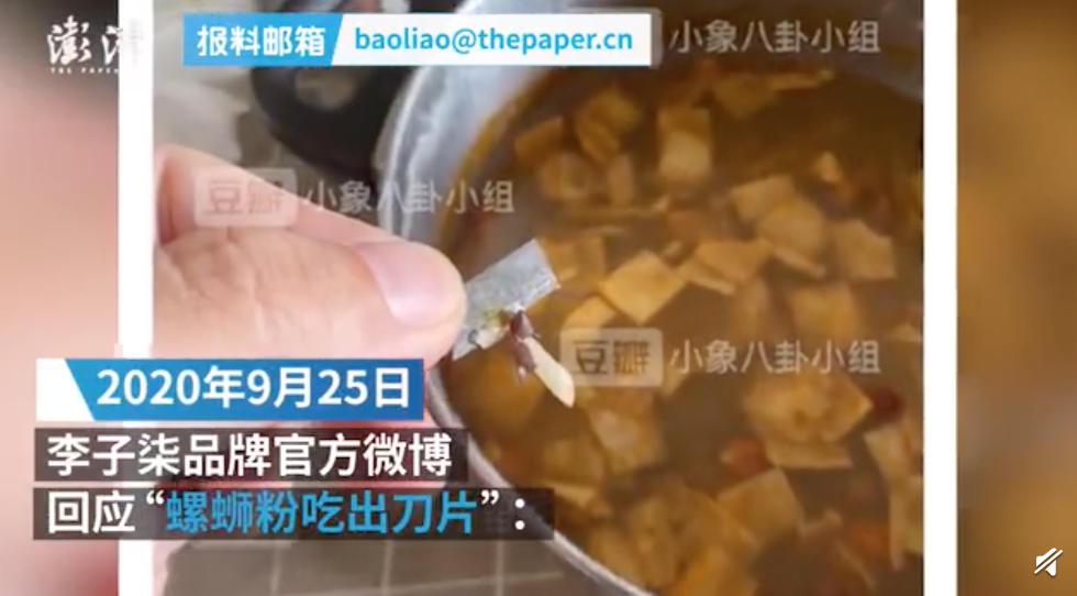 9月23日,有网友发布题为“劝大家不要买李子柒的螺狮粉,吃出刀片”的帖子。该帖称,其友人在进食李子柒品牌的螺蛳粉时,“吃着吃着发现了刀片,嘴也被划伤了”,该帖还附上指甲盖大小的刀片的拍摄图和李子柒螺蛳粉的商品包装图。
