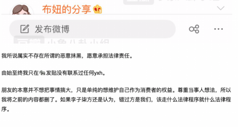 就在@李子柒品牌官方微博 声明发布当天,爆料人火速发文回应称“我所说属实不存在所谓的恶意抹黑,愿意承担法律责任”。另该爆料人称基于对其朋友的本意是“不想把事情搞大,只是单纯的想维护自己作为消费者的权益”,其删除了原本爆料内容。